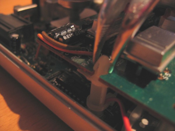 Then you can detach the switchboard from the mainboard by squeezing the three stand-off tips with pliers, and lifting the board a little.