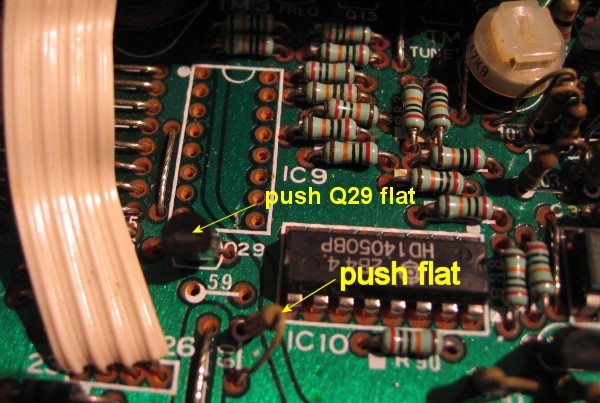 To allow clearance for the MIDIBass board, transistor Q29 and resistor R60 must be gently pressed flat to the PCB - Q29 can only be flattened once R59 is out of the way: