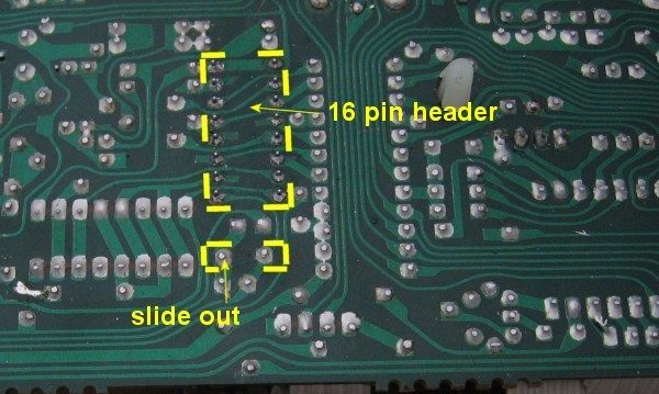 And here are the pads underneath you must de-solder to remove the IC and resistor. Once the IC is removed, the 16 pin DIL socket should be soldered in its place.