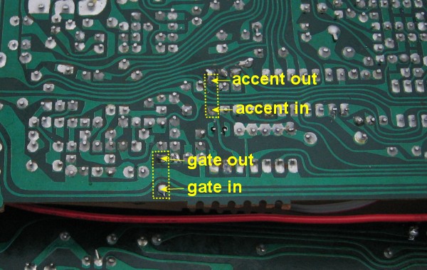 Here are resistors R146 (carrying the GATE signal) and R141 (ACCENT):