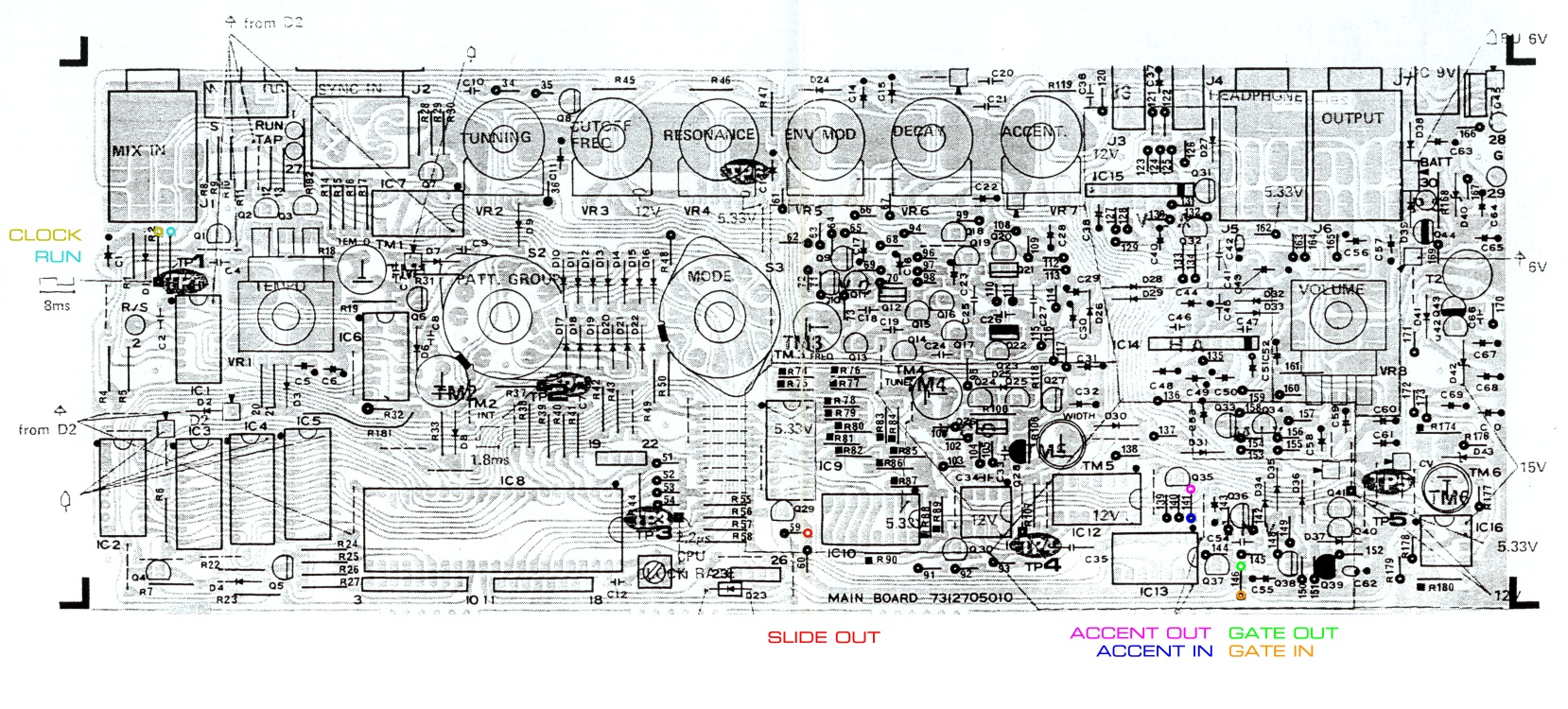 For clarity, here is an image showing the connection points for the MIDIBass wires superimposed on the component layout of the 303 from the service manual.