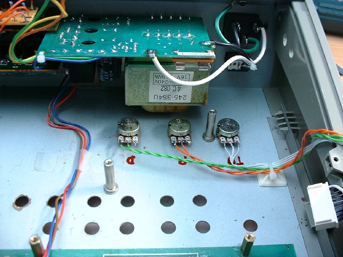 A 100k linear pot and 10k resistor are soldered in, in series, to *replace* the original resistor R59. The 100k pot is the middle of the three in the photo above. Note the pins the two wires are soldered to.